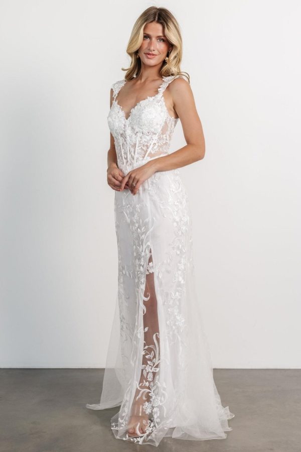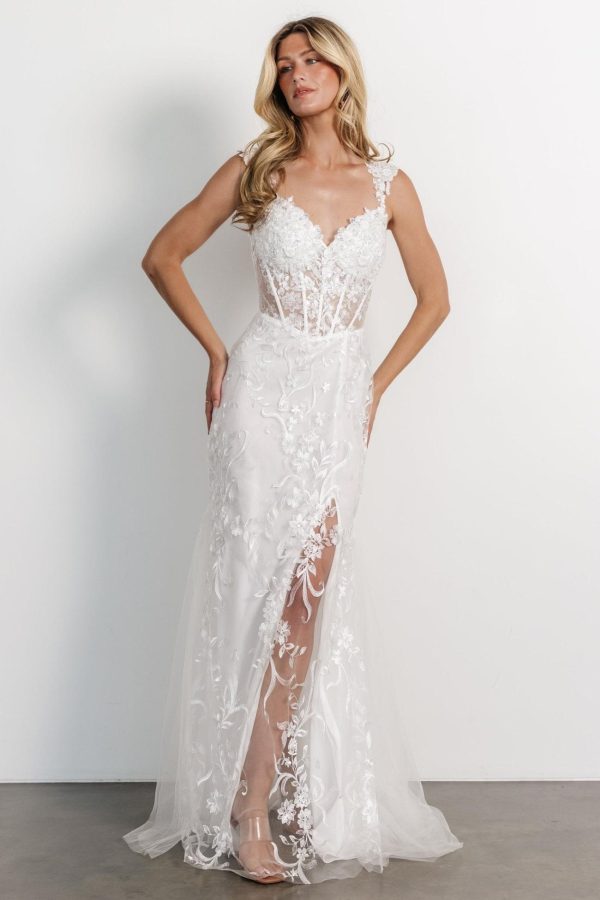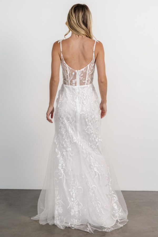 - Sheer mesh bodice with floral embroidery and luminous sequin embellishments
